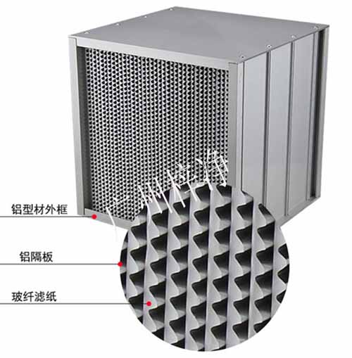 鋁隔板高效過濾器采用隔板式設計,波紋形隔板可以精確地保持褶層間距、在更小阻力下,更大限度地利用濾料。