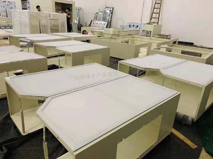 本實用新型通過將整個層流送風天花的箱體分解為多個板材,通過卡扣連接各板材,便于快速拆裝和搬運,并通過發泡密封膠條將連接處密封,確??諝鈨艋|量;過濾板采用過濾框架+濾網的結構,既穩固且出風面積也大,內嵌安裝也很美觀;整個箱體表面平整,沒有死角,便于清洗。
